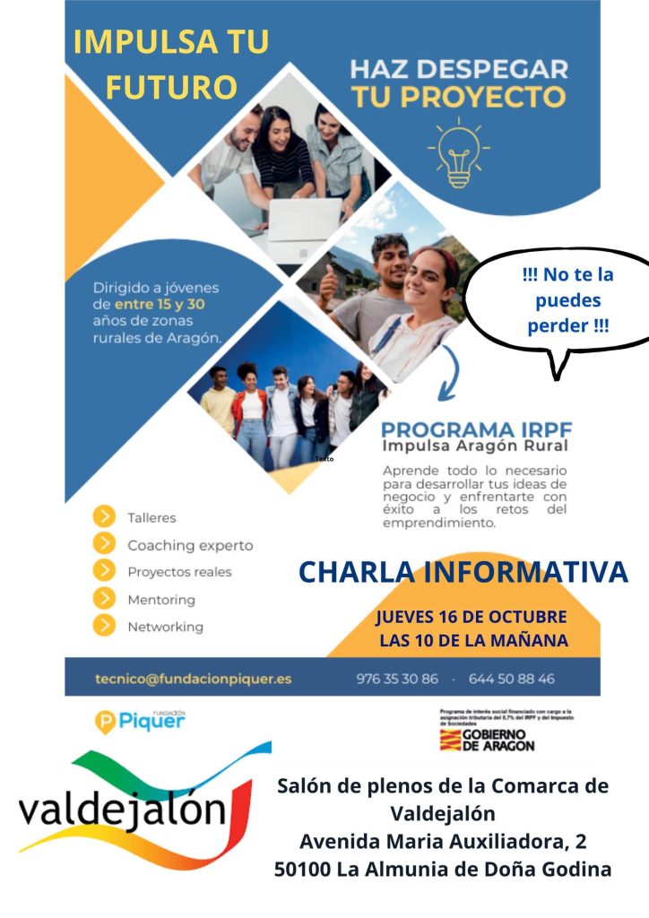 8 de octubre de 2025El próximo jueves 16 de Octubre, a las 10 de la mañana, en el Salón de Plenos de la Sede Comarcal, se ha relizar una charla dirigida a jóvenes entre 15 y 30 años para impulsar futuros proyectos y desarrollar idea de negocio que impulsen el medio rural. Si eres un joven emprendedor, no te lo puedes perder!! #ayuda #empredimiento #soyrural #valdejalon #tierraparavivir