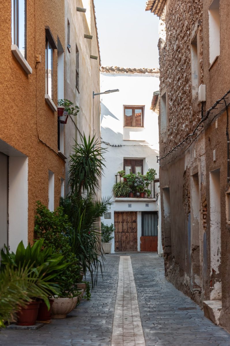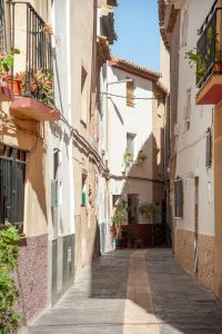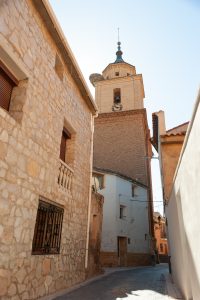 El centro de la población lo ocupa la iglesia y una casa señorial con la que se comunica directamente mediante un paso elevado. En el frente se ha formado una amplia plaza. En torno a este centro monumental se desarrolla el caserío de forma casi circular; son calles quebradas con pasos cubiertos sobre calles, callizos y pequeñas plazas en recoveco. Es un urbanismo típicamente morisco; hay tres plazas dispuestas en torno a la iglesia, con algunas casas del siglo XVII. A una de ellas da la portada.